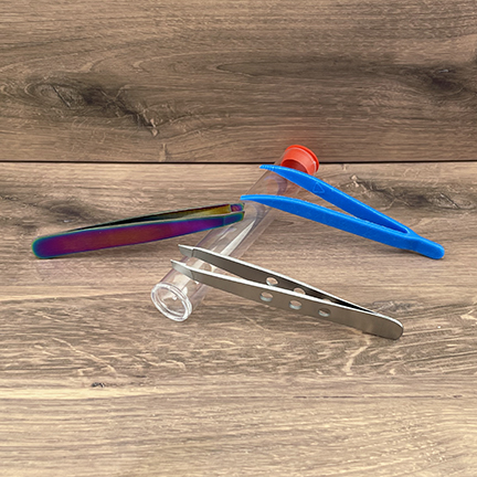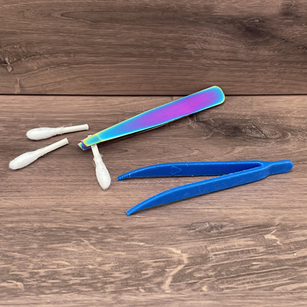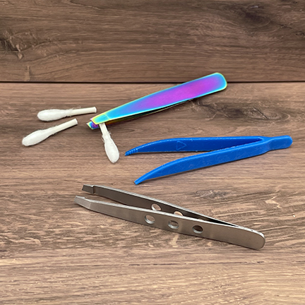 Tweezers | All 3 Styles of Tweezers, Rainbow Metal Tweezer, Silver Metal Tweezer, 1 Plastic Tweezer, Rainbow Metal Tweezer in a case, Silver Metal Tweezer in a case, 1 Plastic Tweezer in a case, 1- Rainbow and 1- Plastic Tweezer |